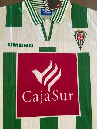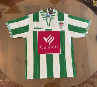 Camiseta de fútbol retro del Córdoba Club de Fútbol de la temporada 1998-99. Un diseño clásico con las icónicas rayas verdes y blancas. - Marca Umbro. - Logo de CajaSur en el frontal. - Escudo del club en la parte superior. - Talla L.