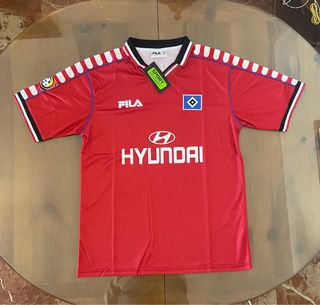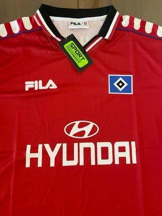 Camiseta de fútbol retro del Hamburgo SV, edición de la temporada 2000. - Color rojo vibrante. - Diseño clásico con detalles en las mangas. - Logo de Fila y escudo del club. - Patrocinador Hyundai en el frontal.