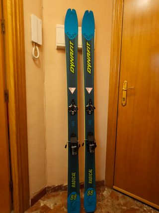 Set de esquís de travesía Dynafit Radical 88 con fijaciones Dynafit y pieles de foca Kohla. La fijación la pedí ajustar a suela de bota 302, la fijación permite +/- 5mm (suelas entre 297 y 307) Radical 88 tienen una anchura de 88 mm en el patín. Por lo tanto, son unos esquís muy versátiles, sean cuales sean las condiciones. Tanto en nieve dura como en polvo, los Radical 88 se adaptan perfectamente. Además, gracias a esta característica, ofrecen un muy buen equilibrio entre ligereza en la subida y buena estabilidad en la bajada. Se compraron éste año, utilizados 5 veces