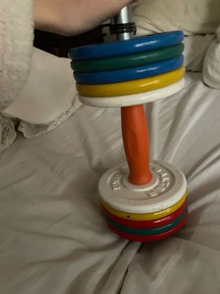 -Pesa - Incluye 8 discos de 0,5 kg cada uno. - Discos de colores: blanco, amarillo, rojo, verde y azul. - Empuñadura naranja. -Marca Salter.