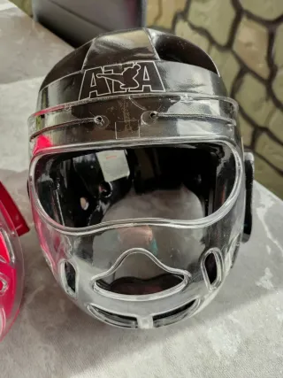 Casco de protección para taekwondo, talla M junior. Diseñado para ofrecer seguridad durante el entrenamiento y la competición. - Color rojo brillante. - Visera transparente para una visión clara. - Cierre ajustable para un ajuste seguro.