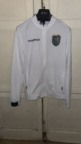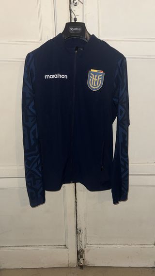 Camiseta original de la Federación Ecuatoriana de Fútbol (FEF) con logo de Marathon. - Color azul marino. - Diseño con detalles geométricos en las mangas. - Cierre de cremallera frontal.