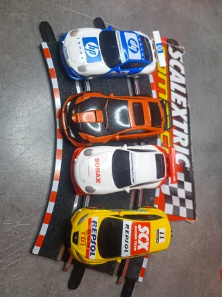 Conjunto de 4 coches de Scalextric Compact en escala 1/43. Los coches son de diferentes modelos y colores. Usados y funcionando Precio por los 5 - Coche 1: Blanco y azul con logo HP. - Coche 2: Naranja y negro. Con luces - Coche 3: Blanco y rojo con logo Sonax. - Coche 4: Amarillo con logos Repsol y SCX.