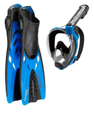 Conjunto de Cressi para snorkel, incluye máscara de snorkel integral y aletas. - Máscara de snorkel integral Cressi Baron. - Aletas Cressi Tonga. - Color azul y negro.