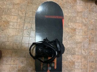 Tabla de snowboard negra con detalles en rojo y fijaciones incluidas. Lista para la montaña. - Diseño deportivo. - Fijaciones negras ajustables. - 154 cm de largo.