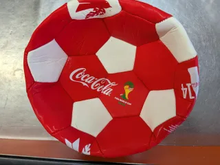 Balón de fútbol conmemorativo de Coca-Cola para la FIFA World Cup 2014. Diseño clásico de hexágonos y pentágonos en rojo y blanco. - Logo de Coca-Cola. - Emblema de la FIFA World Cup 2014. - Número 14 visible.