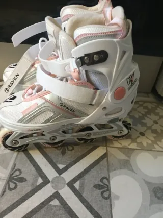 Patines en línea de color blanco con detalles en rosa y gris. Son ajustables y cubren la talla 37 hasta la 40. Su precio en amazon esta en 74 euros - Marca: Raven - Cierre con velcro y hebilla - Ruedas de poliuretano