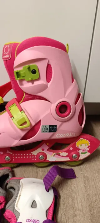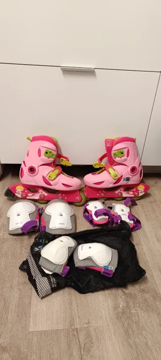 Set de patines en línea y protecciones. Tallas 30 a 34. - Patines rosas con detalles verdes y amarillos. - Incluye protecciones para rodillas, codos y muñecas. - Las protecciones son blancas con detalles morados. - Vienen en una bolsa de malla negra.