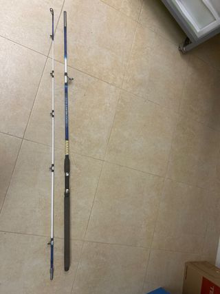 Caña de pescar de dos piezas, ideal para pesca en embarcación o desde costa. - Color azul y blanco. - Empuñadura de goma. - Anillas de alta resistencia.