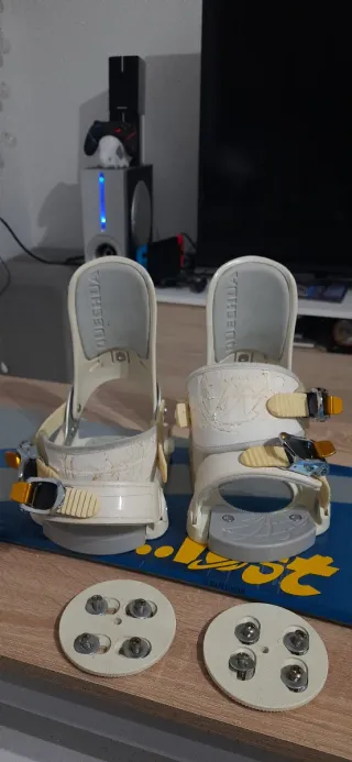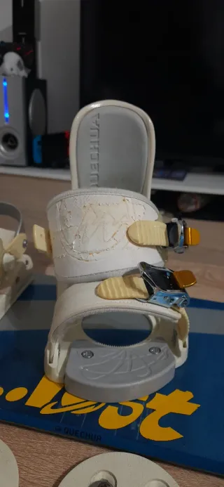 Tabla de snowboard con fijaciones. Tabla marca QUECHUA + fijaciones blancas y doradas. Muy poco uso, se encuentra en buen estado. - Diseño con detalles en azul y blanco. - Fijaciones incluidas - talla M (hasta 41) Mide 1,56 m de alta, 26 cm de ancho en el centro y 29 cm en los extremos.