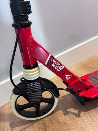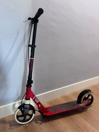 Patinete Oxelo MID 9 en color rojo. Diseñado para ofrecer una experiencia de patinaje ágil y cómoda. - Marco de aluminio resistente. - Ruedas de 200 mm para un desplazamiento suave. - Sistema de plegado rápido. - Freno trasero. - Altura ajustable del manillar.