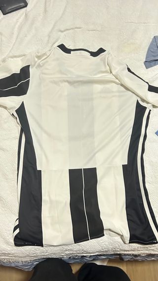 Camiseta de fútbol de la Juventus de la temporada 2016-2017. - Diseño a rayas blancas y negras. - Logo de Adidas en el pecho. - Escudo del club con estrellas. - Patrocinador principal visible.