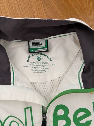 Chaqueta deportiva del Real Betis Balompié, modelo vintage. - Diseño en blanco con detalles en verde y gris. - Logo RBB en la manga. - Cierre de cremallera frontal.