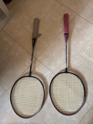 Dos raquetas de bádminton de la serie JZ 2000 de Van Allen. Incluyen sus fundas protectoras. - Raqueta con funda azul. - Raqueta con funda amarilla.
