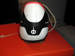 Botas de fútbol Nike con diseño moderno. - Parte superior blanca y negra. - Detalle de color rojo en el cuello. - Suela con tacos.