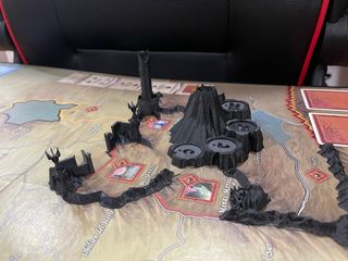Escenografía para el juego de mesa La Guerra del Anillo. Incluye todas las montañas más el monte del destino y las torres de Barad Dur y Orthanc - Incluye varias estructuras y elementos del paisaje. - Diseño detallado en color negro.