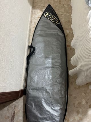 Tabla de surf con un diseño llamativo de ave fénix en tonos naranjas y blancos sobre fondo negro. - Diseño artístico de ave fénix. - Fondo negro con detalles. - Incluye funda protectora.