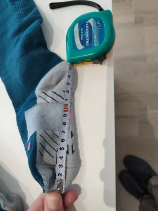 Lote de siete pares de calcetas de fútbol para niño. Hay tres que no se han estrenado y cuatro que tienen muy poco uso... - Calcetines altos de diferentes colores: azul marino, azul, azul claro con detalles blancos, rojo, azul verdoso, negro y azul oscuro. - Logos de marcas deportivas visibles en algunas calcetas. - Detalles de rayas y texturas en varios pares.