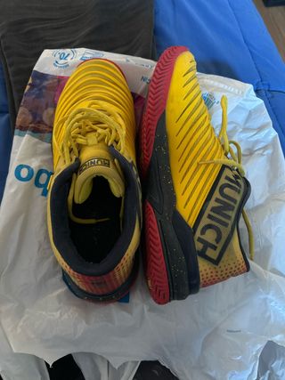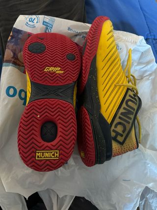Zapatillas de pádel Munich en color amarillo y detalles en rojo y negro. Diseñadas para ofrecer buen agarre y comodidad en la pista. - Exterior de malla transpirable. - Suela de goma para mayor tracción. - Cierre con cordones.