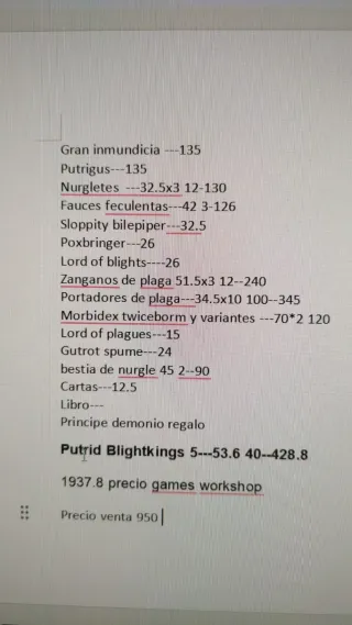 Se vende ejército de Nurgle, ideal para coleccionistas y jugadores. - Gran Inmundicia x2 - Putrigus - Nurgletes 15 - Fauces Feculentas x3 - Sloppity Bilepiper - Poxbringer 3 - Lord of Blights - Zanganos de Plaga 12 - Portadores de Plaga (100 - Morbidex Twiceborn y variantes (2) - Lord of Plagues - Gutrot Spume - Bestia de Nurgle (2) - Cartas - Libro - Príncipe demonio regalo - Putrid Blightkings 40 Precio algo negociable
