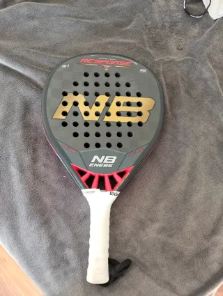 Pala de pádel NB Response con diseño deportivo. - Marco con acabado en negro y detalles en rojo. - Superficie con agujeros. - Logo NB en dorado. - Grip blanco.