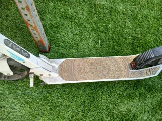 Patinete con un diseño único y llamativo. - Plataforma con estampado de mandala. - Estructura de color blanco. - Ruedas negras.