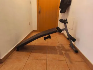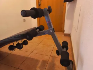 Banco para ejercicios abdominales con estructura metálica. Con mancuernas de 1,5 klg - Respaldo acolchado. - Rodillos para tobillos. - Diseño plegable para fácil almacenamiento.