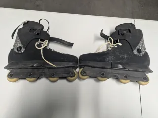 Se venden patines USD Agressive Freestyle en color negro. Perfectos para patinaje agresivo y freestyle. - Diseño robusto y duradero. - Cierre de velcro y cordones. - Ruedas de poliuretano.