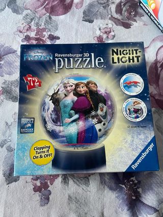 Puzzle 3D de Ravensburger de la película Frozen, con efecto Night-Light. - Incluye 72 piezas. - Tecnología Easyclick para un encaje perfecto. - El puzzle se ilumina en la oscuridad. - Diámetro aproximado de 13 cm.