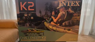 Kayak hinchable Challenger K2 Intex, ideal para dos personas. Su diseño es llamativo y está pensado para la diversión en el agua.utilizado 4 veces comprado en Intex. - Color verde con detalles en azul y negro. - Incluye asientos inflables. - Red de carga frontal.