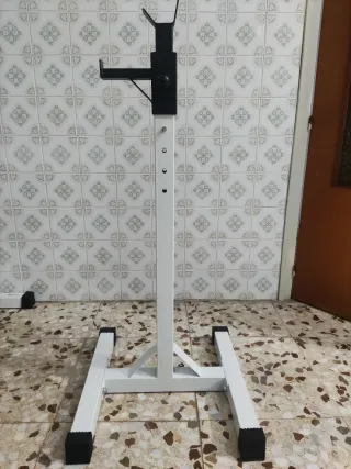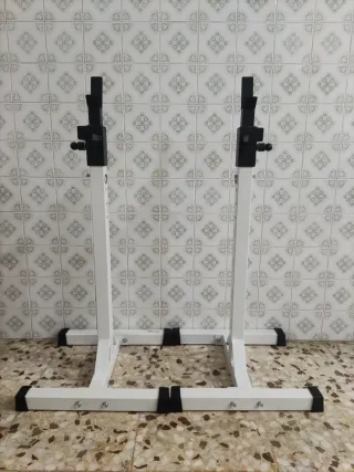 Soporte para barra de pesas, ideal para entrenamientos en casa. Muy poco uso, está como nuevo. Se puede regular en altura. Peso máximo 150kg. - Estructura de metal blanco. - Soportes negros para la barra.