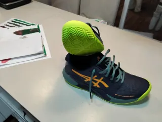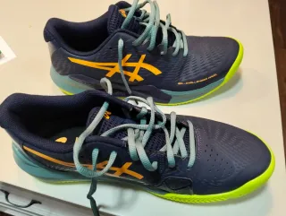 Zapatillas de pádel Asics Gel-Challenger Pro en color azul marino con detalles en amarillo y verde lima. - Diseño deportivo. - Cordones de ajuste. - Suela de goma.