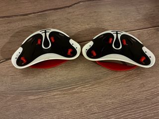 Par de palas de natación Speedo en color blanco y negro con detalles en rojo. - Diseño ergonómico. - Correas ajustables para los dedos y la muñeca. - Marca: Speedo.