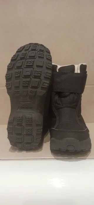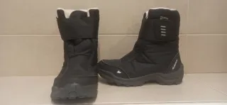 Botas de nieve Quechua en color negro, perfectas para mantener los pies calientes y secos en la montaña. - Cierre de velcro. - Interior forrado de pelo sintético. - Suela de goma antideslizante. En buen estado, los niños crecen muy rápido.
