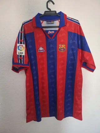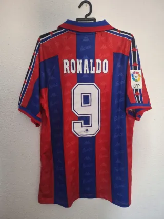 Camiseta réplica del FC Barcelona de la temporada 1996/97, con el dorsal de Ronaldo. - Diseño a rayas rojas y azules. - Logo de Kappa. - Escudo del FC Barcelona. - Parche LFP.