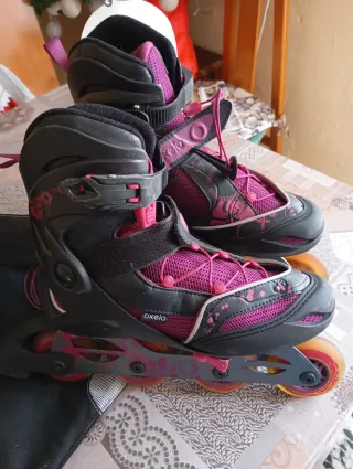 Se venden patines en línea Oxelo en color morado y negro, ideales para disfrutar del patinaje. - Diseño con cordones y cierres de velcro y hebilla. - Ruedas de color naranja. - Incluye bolsa de transporte negra con estampado floral.
