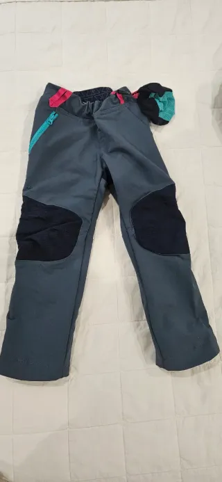 Pantalón de nieve para niños, ideal para actividades al aire libre. - Color gris oscuro. - Refuerzos en rodillas. - Cremallera lateral. - Detalle de cintas fucsia y turquesa.