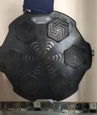 Placa de boxeo electrónica con diseño hexagonal y luces. - Incluye guantes de boxeo. - Superficie con patrones de laberinto. - Indicadores luminosos.