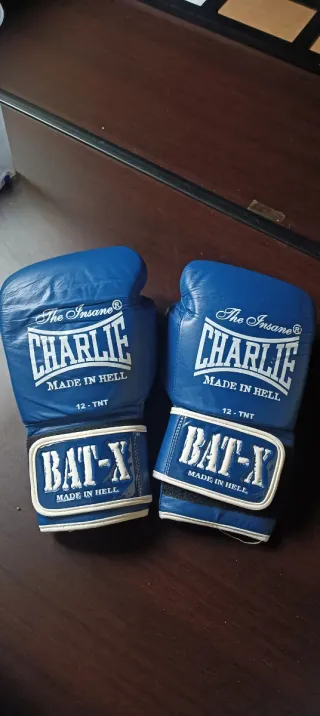 Par de guantes de boxeo de la marca Charlie, con un diseño llamativo y un peso de 16 oz. - Color azul con detalles en blanco. - Diseño The Insane y Made in Hell.