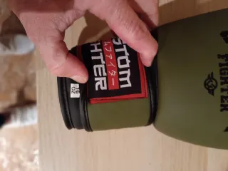 Guantes de boxeo de la marca Custom Fighter en color verde militar. - Diseño con estrellas y logo. - Cierre de velcro. - Etiqueta con texto en japonés y OZ.