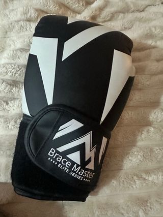 Guantes de boxeo de la marca Brace Master, modelo Elite Series. Usados en contadas ocasiones. Como nuevos. - Talla 12 OZ. - Diseño en color negro con detalles blancos. - Cierre de velcro ajustable.