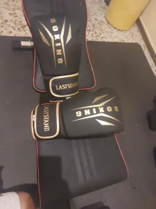 Par de guantes de boxeo negros con detalles dorados. - Marca: LASTSTAND - Diseño con la palabra BOXING en dorado. - Cierre de velcro. Los vendo por que al final no le apunte a boxeo