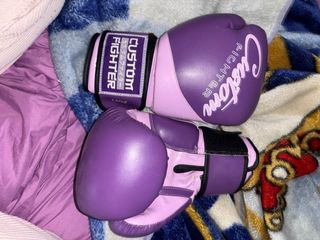 Par de guantes de boxeo de la marca Custom Fighter en color morado y lila. Perfectos para entrenamiento. - Diseño bicolor morado y lila. - Cierre de velcro. - Etiqueta con logo y 14OZ. - poco uso