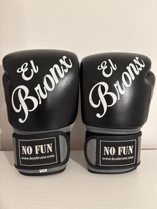 Par de guantes de boxeo de la marca El Bronx. - Color negro con detalles en gris. - Cierre de velcro. - Tamaño 16 oz. Precio original: 50€ Se has usado durante medio año con 3 sesiones por semana.