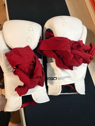 Set de guantes de boxeo y vendas de entrenamiento, casi no los he usado ya que me lesione la muñeca. - Guantes de boxeo blancos con cierre de velcro. - Vendas de boxeo rojas.