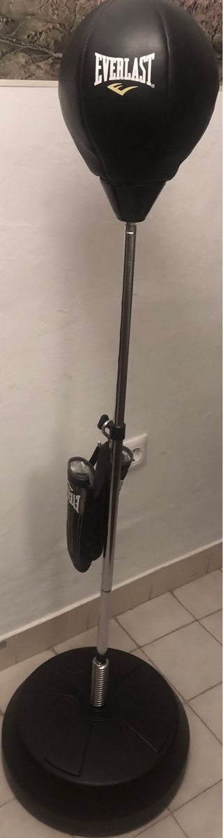 Saco de boxeo de pie de la marca Everlast, ideal para entrenamientos. - Base redonda y estable. - Columna ajustable. - Incluye guantes de boxeo.