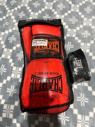 Set de guantes de boxeo Charlie The Insane en color rojo y vendas Leone. - Guantes de boxeo Charlie The Insane. - Vendas Leone. Con muy poco uso