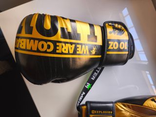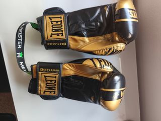 Guantes de boxeo Leone Nexplosion, modelo 1947. - Color negro y dorado. - Cierre de velcro. - Talla 10 oz (tamaño).