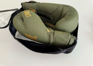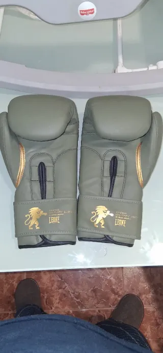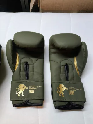 Par de guantes de boxeo Leone, edición militar. - Color verde militar. - Detalle dorado en el lateral. - Cierre de velcro. - Logo de león dorado. -1 cm despegado en final del guante por pequeño engsnchon!