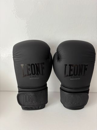 Guantes de boxeo de la marca Leone 1947, edición Black Edition. Color negro. Cierre de velcro. La funda original está un poco rota.
